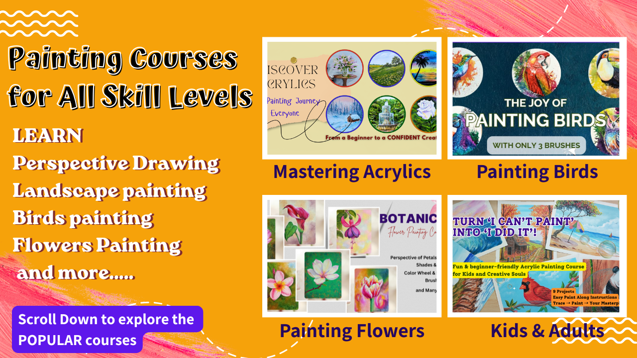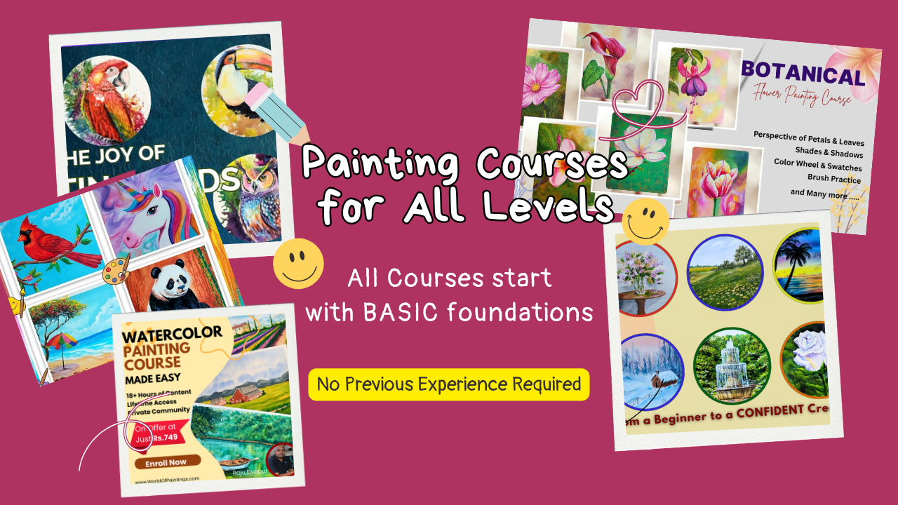 Welcome to the most beginner-friendly online learning platform for acrylic painting, watercolor painting, and oil pastel art courses. Whether you’re starting for the first time or returning to painting after years, our structured, easy-to-follow lessons help you build confidence from Day 1.